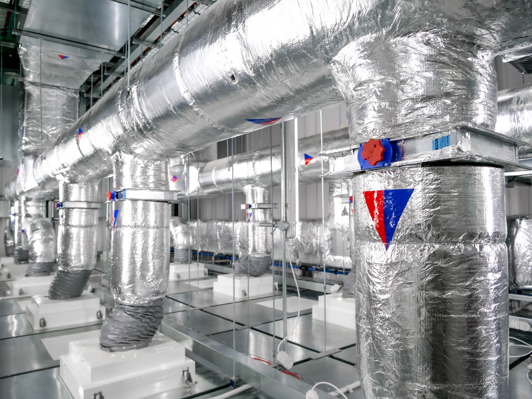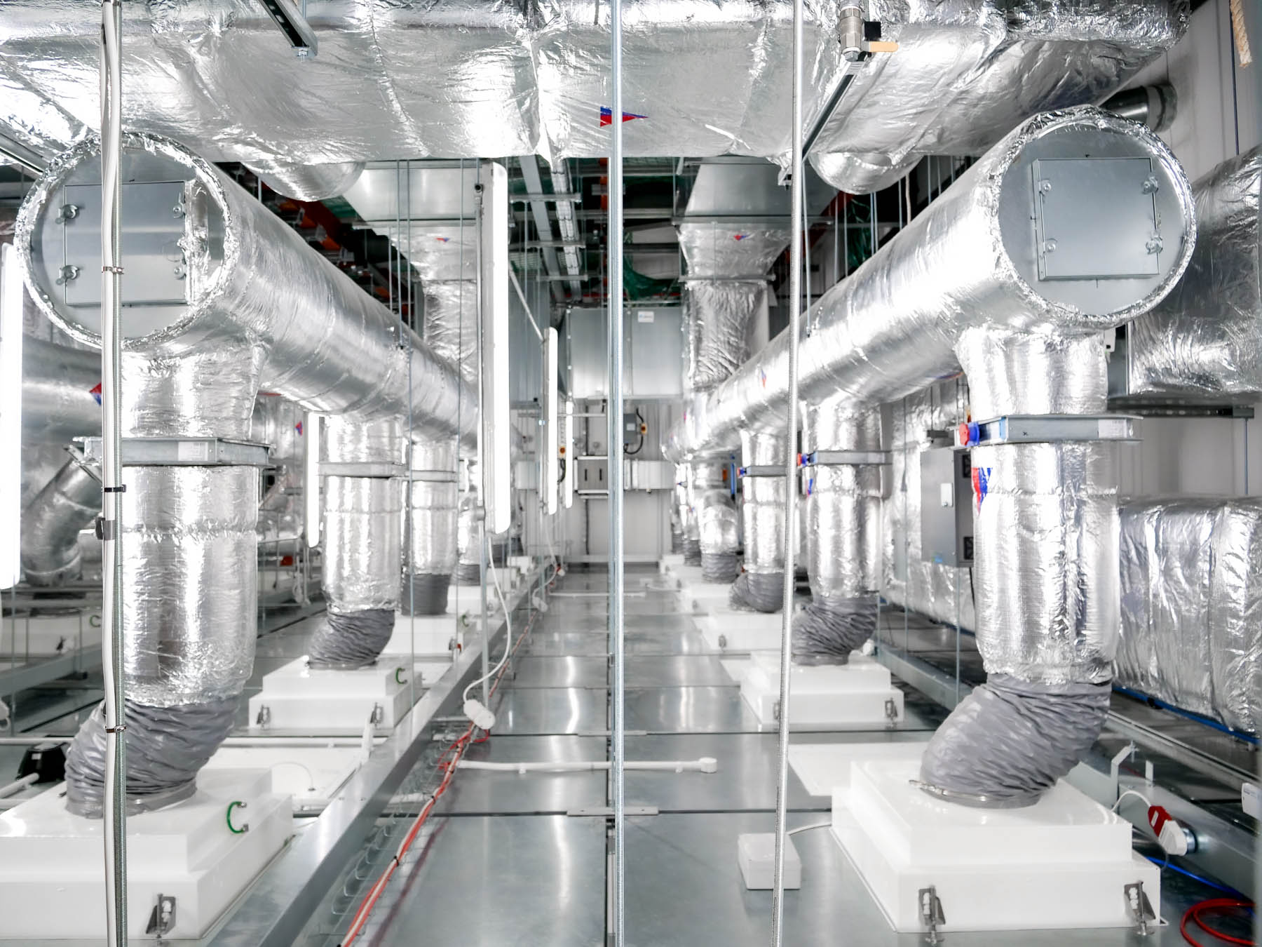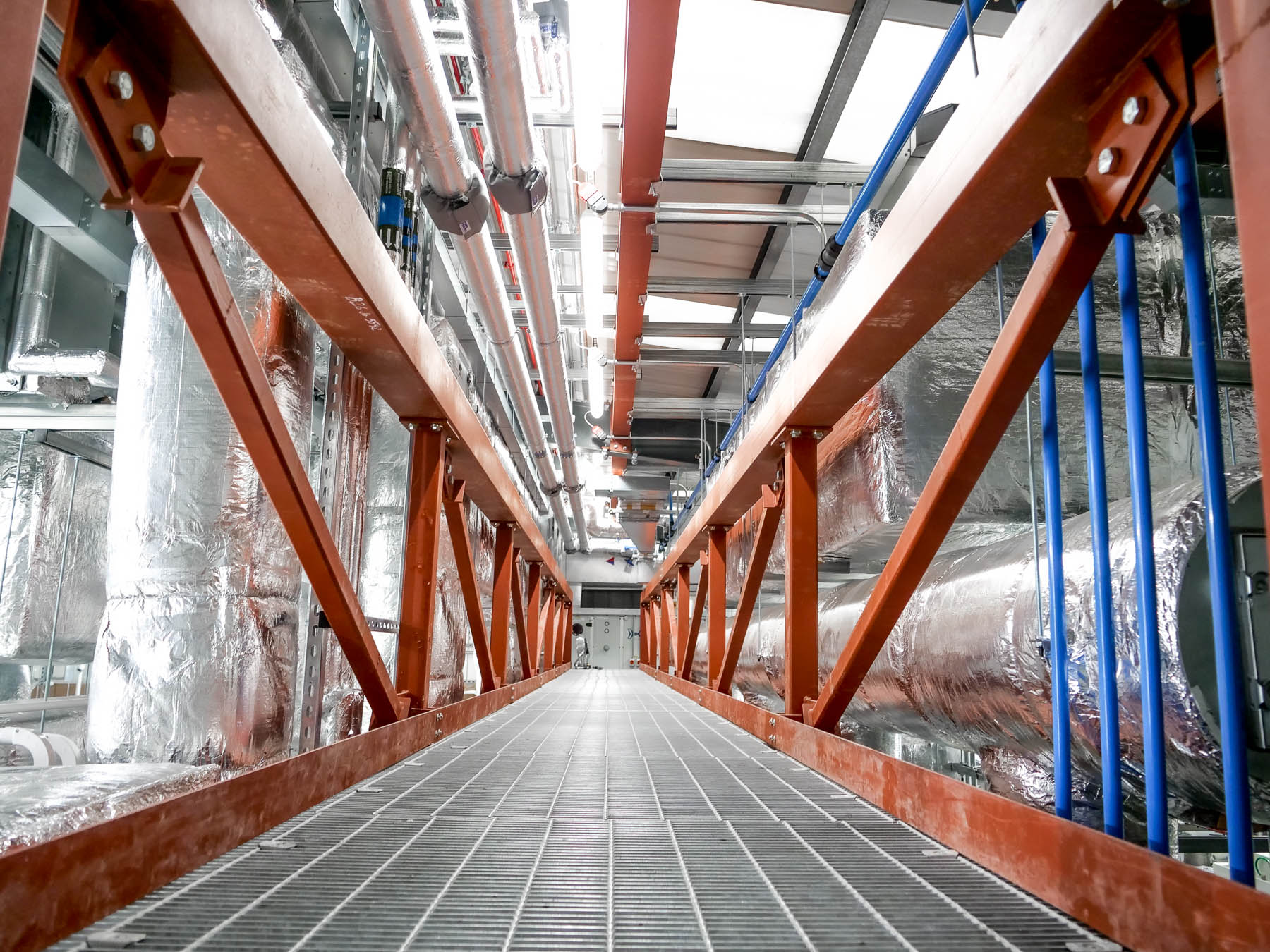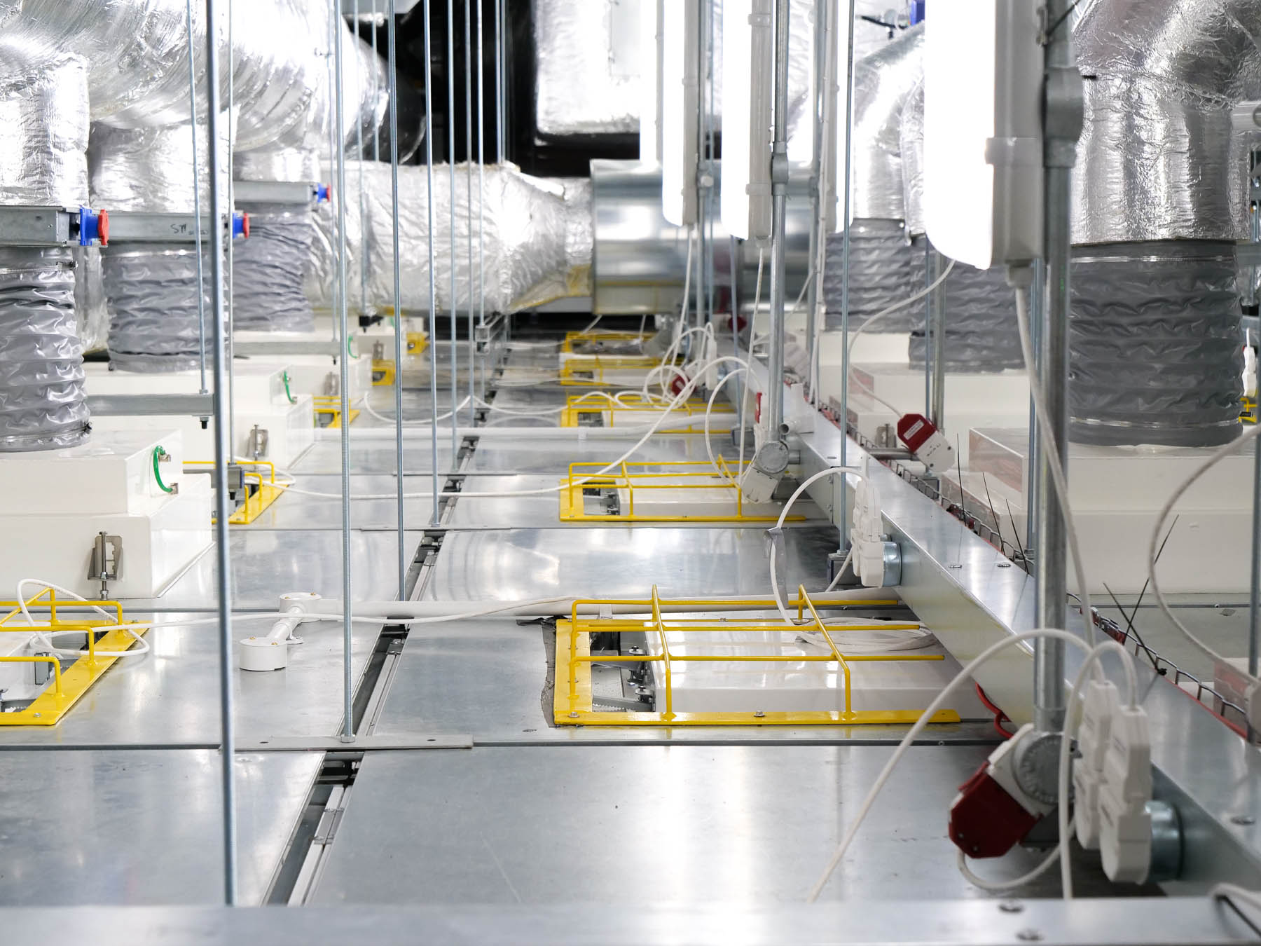 A steel sub-structure was constructed to support the air-handling and management systems above ground-floor cleanroom space, incorporating a loading bay and heavy-load bridge to allow substantial air-handling equipment to be installed above the hygienic, walk-on ceiling.